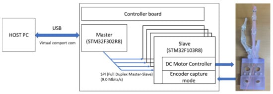 We recently showed the controller board can control DC motors simultaneously, as shown in Figure 12. Since the development of the control board with API is underway for issue (1) above, a myoelectric prosthetic hand with five fingers that has multiple degrees of freedom will be a future work. The issues (2)–(4) have not yet been solved in this study, but the proposed myoelectric prosthetic hand can express stiffness by controlling multiple extensor and flexor muscles from surface myoelectrogram (sEMG) signals. There was some research reporting on myoelectric prosthesis with the pattern recognition technique [18,19,20,21]. We have proposed a mathematical model to predict joint torque and stiffness from sEMG signals and have conducted research to effectively use not only kinematic information but also kinetic information. Our previous works reported the myokinetic (Mykin) model, which can estimate the angle, torque, and stiffness of joints from muscle activities [22,23]. Predicting the viscoelasticity of muscles is a key role since normal subjects interact with objects by adjusting the viscoelasticity of muscles based on predictions of the arm’s orbital coordinates in the outside world and the weight of the object. Using this research, future work will install the sEMG measurement and automatically control the motor with the calculated tension from sEMG signals. The missing muscle signals are proposed to be predicted from the remaining muscles using the muscle synergy methods [24,25,26,27].