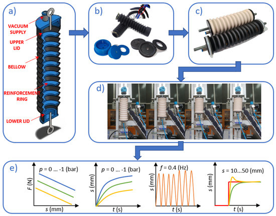 The process of development and experimental assessment of bellow PMAs: (a) 3D model of the design with its main elements; (b) used off-the-shelf bellow and parts developed by using additive manufacturing; (c) assembled devices; (d) device mounted and examined on the test-bench; and (e) experimental assessment of the operating parameters and position control.