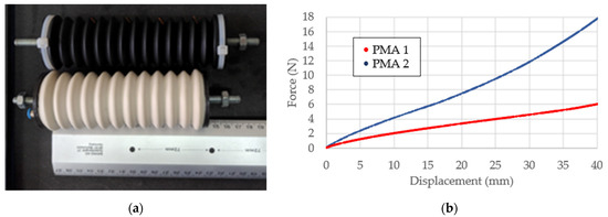 No-load experiments (Figure 6a) resulted in a maximum displacement of 68 mm for PMA1 and 55 mm for PMA2, both at the vacuum value of p = −0.7 bar. Considering the initial lengths of 160 and 140 mm for PMA1 and PMA2, respectively, the contraction ratio can be calculated dividing the measured maximum displacement by the initial actuator’s length. This calculation resulted in ε = 42.5% for PMA1 and ε = 40% for PMA2. It has to be noted here that the contraction ratio can be increased in the design phase by further reduction of the thickness of the inner rings and by increasing the distance between bellow ribs.