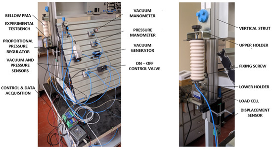 The bellow PMAs are mounted on the vertical strut profile using upper and lower holders, allowing also linear motion by sliding on the strut profile. The upper holder and the vertical profile are fixed by a screw connection, and the lower holder is movable but also has the possibility of being fixed. On the lower profile are affixed the load cell and the potentiometric displacement sensor. The vacuum generator function is based on the Venturi principle. Therefore, a proportional pressure regulator, with an operating range from 0 to 10 bar is used as an input pressure source. For the used FESTO vacuum generator, the input value of the air pressure ranging from 0 to 8 bar results in the vacuum range of 0 to −0.8 bar. It has to be noted that this principle is viable in the presented case, considering the relatively slow response time of the developed bellow PMA devices. The user application for data collection and control of the used proportional pressure regulator was developed using the LabVIEW programming environment.