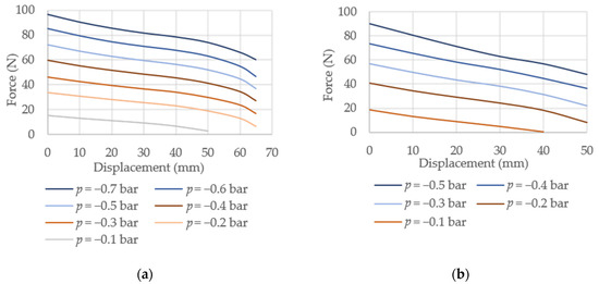 One of the important characteristics of a PMA device is the maximum force it can provide. This experimental investigation involves measuring the maximum blocking force for varying values of vacuum and different positions within the working displacement range. The actuators were placed on the testbench and fixed at their both ends. A load cell used for determining the force values was placed between the lower holder on the supporting structure and the actuator lower end. The experiments were performed for vacuum levels p ranging from −0.1 to −0.7 bar with an increment of Δp = −0.1 bar and displacements with a step of Δs = 10 mm, starting from the reference position. The reference position is the value of displacement for the unloaded actuator, i.e., the position with the maximum length between the lower- and upper-end lids of the actuator. The resulting curves, determined as an average of four repetitions of each measurement, are reported in Figure 5.