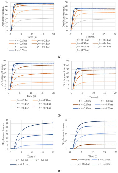 Finally, with the 70 N loading setting (Figure 6c), PMA1 was not able to overcome the load for vacuum amplitudes lower than p = −0.5 bar and PMA 2 for amplitudes lower than p = −0.4 bar. During the experiment for vacuum value p = −0.7 bar, the bending of ribs appeared again, but did not permanently damage the actuator. From the results, it can be seen that a much longer deadband from the activation of the actuator to the beginning of its displacement is present, which is a result of the higher value of the load. Additionally, from the results, it can be noticed that more time is necessary to achieve a maximum value of displacement, especially for PMA1. The maximum value of displacement is much lower than in the previous experiments with a lower value of the external load. Both actuators achieved the maximum displacement at the vacuum value of p = −0.7 bar, which was 40 mm for PMA1 and 38 mm for PMA2, resulting in contraction ratios, ε = 25% for PMA1 and ε = 27% for the PMA2. From the results of the contraction ratios, it can be concluded that PMA1 achieved lower values than PMA2, which was not the case in previous experiments. The reason for that is the high value of load and lower dimensions of PMA1 in comparison to PMA2.