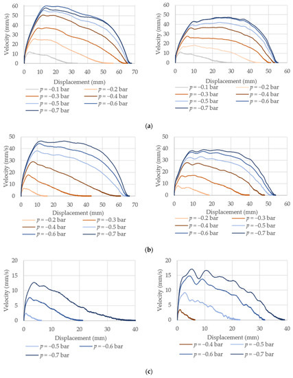 Velocity vs. displacement curves for PMA1 (left column) and PMA2 (right column): (a) without external load; (b) 25 N load; (c) 70 N load.
