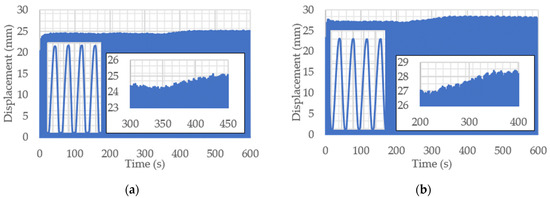 Additional experiments were performed by exciting the system with a sinusoidal signal with the aim of investigating changes in the structural properties of the actuators due to the fatigue, creep and relaxation of material. By using the LabVIEW platform, a graphical interface was developed to generate a sinusoidal vacuum excitation signal with peak-to-peak amplitude of p = −0.5 bar and frequency f = 0.4 Hz. Each actuator was loaded with F = 25 N and subjected to a 10 min oscillatory motion. Within each period of the sine signal (T = 2.5 s), both actuators were moved from the initial position to a maximum achievable displacement and back to the reference position. The results of the displacement over time are shown in Figure 8. In the first 30 s of the experiment, the maximum value of displacement slightly increased and then remained constant until t = 350 s for PMA1 and t = 250 s for PMA2. Then, the displacement slightly increased (Δs ~ 1 mm) due to the inner heating of the material. Since bellow pneumatic actuators are soft actuators, such changes are certainly expected; however, these effects are not significant. Moreover, they can be relatively easily compensated for by appropriate feedback positioning control algorithms, as it will be briefly demonstrated in Section 3.4. Finally, and most importantly, fatigue, creep or relaxation of material were not observed.