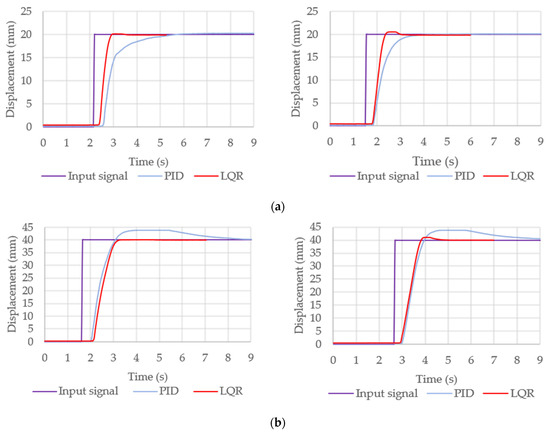 The results of the positioning performances by employing the developed LQR controller for both versions of the actuators are depicted in Figure 9 (red lines) and compared with the previously used PID approach (blue lines).