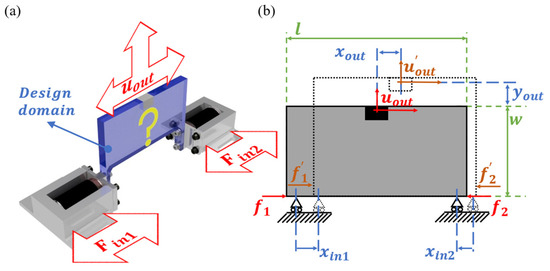 (a) Schematic illustration of a 2-DOF compliance set; (b) Simplification of the design domain and boundary conditions.