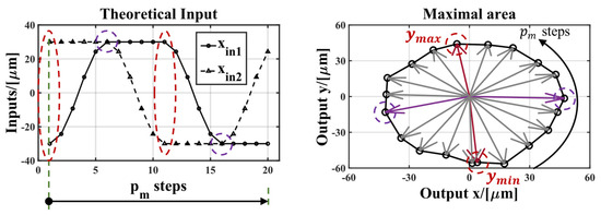 Suppose that the inputs given as in the previous section can be discretized into steps and can simultaneously satisfy the extreme working conditions listed in Table 2. Then, each pair of inputs at step yields a specific output vector, as shown in the schematic illustration in Figure 3. The aim of maximizing a reachable set of the mechanism is equivalently turned into maximizing the interior area bounded by the static trajectory, which is, in general, an irregular polygon. The area of the polygon is given by the -determinant of the individual output vectors at each sampled step along the perimeter of the workspace, as the following [36]: