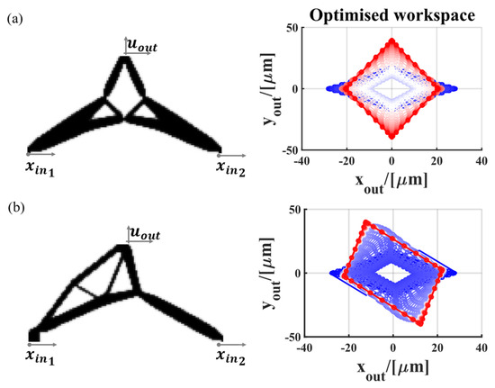 (a) TO results with extreme points set in accordance with the normal configuration in Table 2, and (b) TO results with a tilted output region w.r.t (a), and the calculated output workspace distribution evolution during the iterative optimization process.