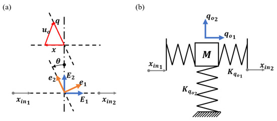 where s and s are the lumped stiffness and damping coefficients of the spring–mass system along the direction of , respectively, is the mass of the system, and the cross terms denote the influence of the spring between the two output directions. An illustration of this reduced system is given in Figure 6b. We can treat the cross terms in Equation (30) as a disturbance term in the form of , and we leave the structural analysis of the cross terms for future research. For simplicity, we now consider the normal configuration, where The expansion of Equation (29) yields a direct tangent space approximation of the relation between the input and the system output as follows: