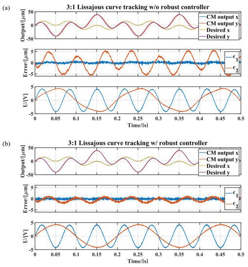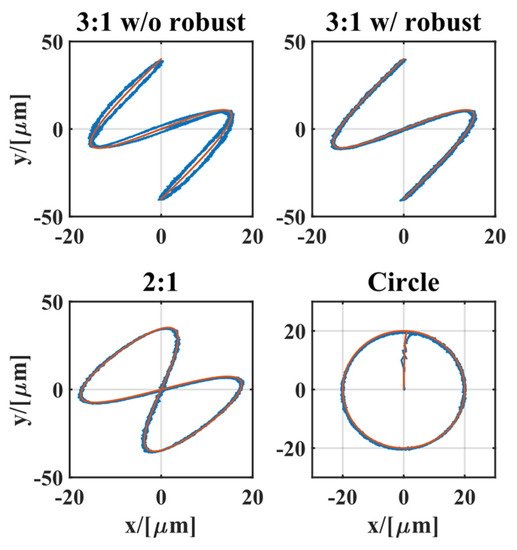 By a careful selection of the compensation controller, the outputs of the PEA units can be seen as ideal displacement sources. Feedforward control is a common approach to compensate for the hysteresis effect [45,46]. The Prandtl–Ishlinskii, Duhem, and Bouc–Wen models were developed to describe the hysteresis effect, which is then used to construct the inverse controller for compensation of effects of hysteresis [47,48,49,50]. These nonlinear models motivated researchers to develop robust feedback controllers such as the sliding-mode controller [51,52], damping controller [53], disturbance observer [31], and adaptive robust controller [54,55]. In these control approaches, the hysteresis nonlinearity is treated as a disturbance to the tangent space systems. Specifically, in this section, an asymmetric Bouc–Wen model [49,56] is chosen to simulate the nonlinear hysteresis of the PEAs.