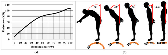 The flex sensors are made of materials that are malleable to some degree without influencing their properties. Due to such properties of flexible piezoelectric material, its resistance varies with bending angle. As is depicted in the line graph and human postural states, the higher the bending level, the higher the resistance value (Figure 1a,b). This sensor is distinguished by its lower cost, longer life, and lower sensitivity to detecting even a small bending degree of the spine [16].