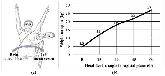 Estimated characteristics of the IMU sensor (a) lateral flexion of human posture and (b) relationship between the head flexion angle in sagittal plane () and weight (kg) imposed on spine.