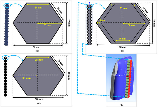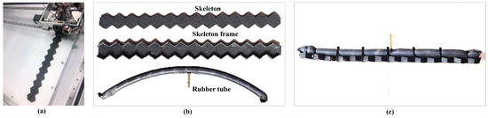 The 3D shape of the skeleton was designed in SOLIDWORKS software, as shown in Figure 4. It mainly consists of two components, which are a flexible solid skeleton (Figure 4a) and a flexible skeleton frame (Figure 4b), where the frame cap was designed separately (Figure 4c). As it is designed and printed separately, gluing, pressing, or welding could be used to seal the cap on the skeleton frame.