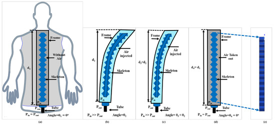 The general scenario of the actuating mechanism with different posture states 1–4 is shown in Figure 5a–d. Posture state-1 (Figure 5a) shows the proper posture of a user while normally standing ( = 0). As there is no air pressure injected in state-1, the pressures inside and outside are the same ( = ).