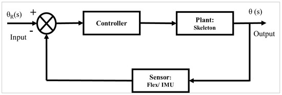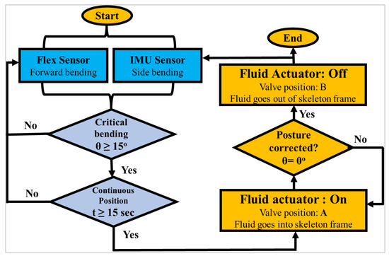 The overview of the control system for the actuator is shown in Figure 6. For a given reference , the angle difference signal is used to decide whether to increase or decrease the skeleton pressure, according to some given preferences and restrictions related to maximum or minimum limits of skeleton pressure and flow rates of the fluid. For this purpose, the sensor obtains the angular displacement () and sends the signal to the controller. Specifically, whenever the skeleton bends in the sagittal plane and makes a certain angle of 15 or more, then the sensor receives the output of the critical angle, which then feedbacks to the controller.