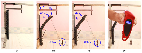 The initial condition of the skeleton (human spine) without any load is shown in Figure 9a. For the main experiment, almost half of the 56 cm long skeleton was attached with a heavy iron bar to keep that part fixed and the rest was left open to check the angular deviation (Figure 9b,c). A cotton rope was used to pull the skeleton with some particular forces. Specifically, one end of the cotton rope was attached to the skeleton, while the other end with a 100–700 gm (≈1–7 N) weight bar in a commonly marked place. Each time the weight bar was moved forward at least 5 cm from the marked place while the air pressure was applied, only then were the pressure (kPa) and changed distance (d) (for finding the angular deviation, and ) taken into account. In general, the air pressure within the tube gradually increased from 0 to 101.4 kPa. Upon application of the pressure, the skeleton was found to be pulled back by a particular force in the range of approximately 1–7 N.