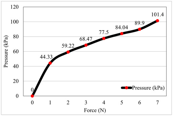 From the experiment, it becomes apparent that, on average, 1 N force can be pulled back by applying 44.33 kPa air pressure (Figure 10). Similarly, for the 2 N force, it takes 59.22 kPa. Like the first two, the rest (≈3–7 N) of the experiments were also conducted with the increased air pressure (≈68–101 kPa, respectively). As observed, both the X and Y scales showed an upward trend to maintain a healthy postural state.