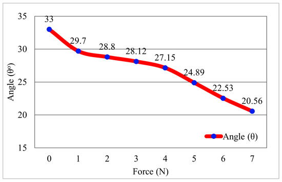 At 0 N force, the angular deflection was recorded as 33, which marginally reduced for the rest of the angular positions (Figure 11). Specifically, at 1 N, the force pulled the skeleton back and reduced the angle by 3.3. It then reached a minimum deviation of 20.56 at 7 N. The trend line proves that, whenever a user experiences a spinal bending with any certain force, the actuator will apply air pressure to the skeleton device. As more air goes inside the skeleton frame, more air pressure will be applied to the spine. Consequently, the air pressure starts pulling the device and pulling back the user. The steady increase in air pressure continues to reduce the postural angular deviation, which eventually leads to a corrected posture automatically.
