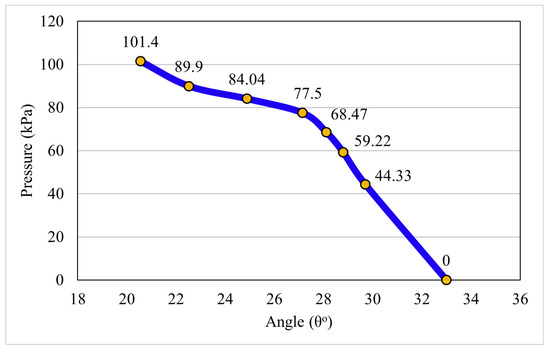 The experiment was conducted numerous times (Table A1, Table A2 and Table A3) to obtain meaningful values of its mechanism consistency and result accuracy of the angular deviation (), pressure (kPa), and force (N). Each time, the skeleton successfully pulled the applied force and reduced the angle significantly (by over 12) from its initial stage. Out of 70 samples, one of the samples of pressure was measured as 95.15 kPa (13.8 psi) at 6 N pulling force (Figure 9d). After measuring all the samples, the average of them makes us draw the following relations.