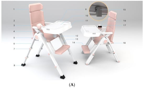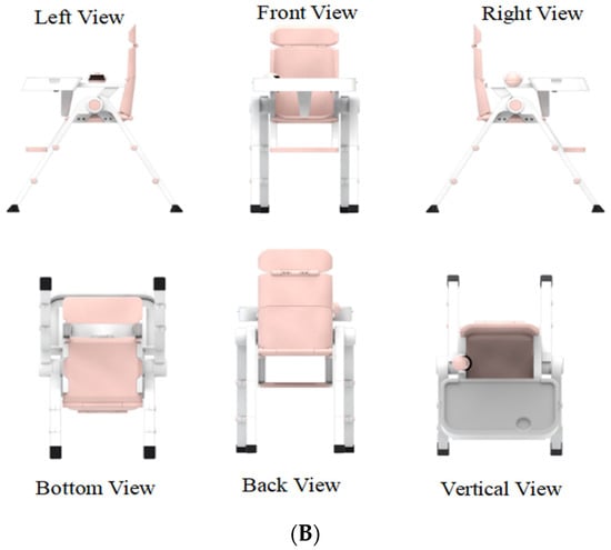This chapter focuses on the development and existing challenges of multifunctional baby chairs. The main idea is to analyze the characteristics of the target users and the problems of using multifunctional baby chairs in daily life. At present, there are many problems in the design of multifunctional children’s dining chairs, such as uneven quality, single function, poor ergonomic matching, and insufficient fun [32]. By taking into account safety, functionality, growth, and enjoyment, an optimized functional design of a multifunctional baby chair is shown in Figure 1A,B.