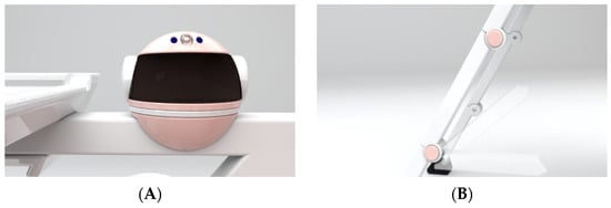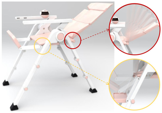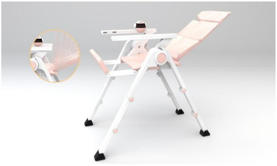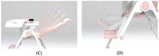 The main functions of the multifunctional baby chair are to interact, accompany and guard children. As an intelligent multifunctional children’s dining chair, it is equipped with an artificial intelligence system (Figure 2A), which has the functions of interaction, companionship and guardianship, ensuring the safety and entertainment of children. (Note that at present, we integrate the artificial intelligence system without focusing on the detailed functionality implementation, which will be our future work.) There are three heights of support legs (Figure 2B), which can meet the needs of different periods as the baby grows and ensure the comfort of use. The backrest can be rotated and adjusted (Figure 2C) to reach comfortable sitting, crouching and lying modes at will. There is a flexible rotation of the footrest (Figure 2D), with the baby’s different sitting positions and flexible change, so that the feet have strong support at any time. In addition, its flexible foldability can not only meet different needs and environments but also be quickly stored and transported. Therefore, it is a caring, intelligent product that can meet the needs of both babies and parents.