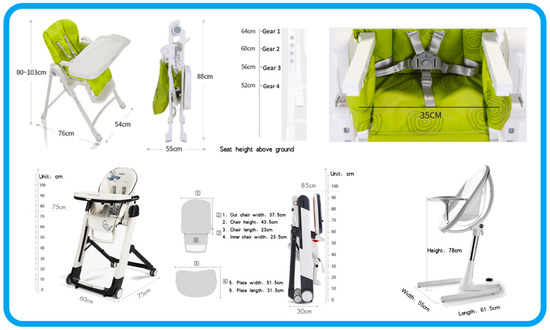 Due to the rapid changes in the children’s consumer market, there are many new brands rising and old brands declining every year [33,34,35]. At present, the most influential domestic brand is “GoodBaby” (Goodbaby International Holdings Limited, Jiangsu, China) [33]. The “GoodBaby” children’s dining chair has six thoughtful designs: the whole chair is folded for easy storage and carrying, the height adjustment is suitable for different heights and shapes, the structure is stable to protect the baby, the double-layer plate is easy to clean, the backrest can be adjusted to cultivate the baby’s dining posture, and the footrest can be adjusted to give the baby a comfortable angle. The second is the Norwegian brand STOKKE [34]. This baby chair can be used from the birth of a baby. It can be used as a high chair, making it easy to communicate closely with the baby. Moreover, it has a curved ergonomic design, which is simple and easy to adjust. It is multifunctional and can be customized to your own style, but the price is higher. The top ten brands of children’s dining chairs in the market are: GoodBaby (Goodbaby International Holdings Limited, Jiangsu, China), STOKKE (Stokke AS, Ålesund, Norway), Happy Dino (GoodBaby, Suzhou, China), Fisher-Price (American fisher toy company, New York, NY, USA), IKEA (IKEA, Småland, Sweden), Babyfirst (MAX-INF, Ningbo, China), PegPerego (PegPerego, Italy), SAORS (SAORS, Leshan, China), KUB (Kins Locks Co., Ltd., Zhejiang, China), and AING (Beijing Aiyin Qihang Children’s Products Co., Ltd., Beijing, China) [35].