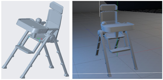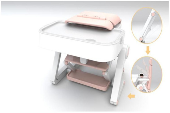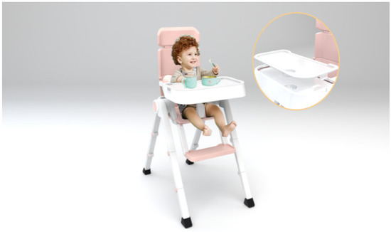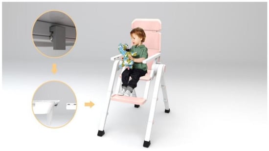 The human body structure should be fully considered in the design process with the following ergonomic principles [30,31,48]. Children have many different characteristics than adults, and the baby chair should be able to change the structure to meet different needs. Taking full account of the child’s psychological and physical needs, more concise and soft lines are used.