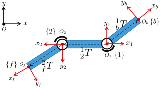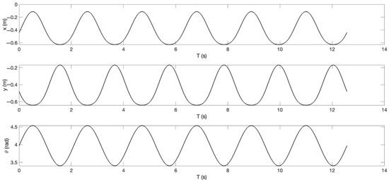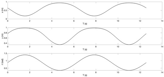where R is the link length of the backrest or the footrest. x m i n ,   x m a x ,   y m i n ,   and   y m a x are the motion ranges due to the mechanical constraints of the baby chair. According to the mechanical design, the link lengths of the backrest and footrest are supposed to be 0.5 m and 0.325 m. Here we double the values to be 1 m and 0.65 m for a stricter situation in terms of stability and control accuracy. The motion ranges expressed in the world coordinates for the backrest are: x m i n = 0.17   m ,   x m a x = 0.94   m ,   y m i n = 0.34   m ,   and   y m a x = 0.98   m , and for the footrest, these values are: x m i n = 0.64   m ,   x m a x = 0.06   m ,   y m i n = 0.65   m ,   and   y m a x = 0.11   m . For comparison, the frequency of the backrest reference motion was set as 1 rad/s, while that of the footrest reference motion was 3 rad/s. Figure 16 and Figure 17 show the Cartesian reference trajectory projected on the x-axis and y-axis for backrest motion and footrest motion, respectively. By calculating the inverse kinematics, we can work out the reference trajectory in joint space, shown as the third row in Figure 16 and Figure 17. All motions start from the mechanical zero, as denoted by the dashed lines in Figure 15.