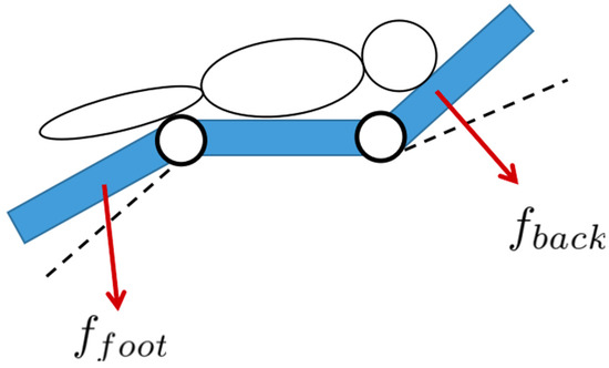 Figure 18, Figure 19, Figure 20 and Figure 21 show the simulation results. Note that we draw the periodic curves in the joint space instead of in Cartesian space for the sake of a better demonstration. Figure 18 and Figure 19, respectively, show the tracking performance for backrest motion control and footrest motion control under a simple impedance control without RBFNN compensation. It can be observed that there is a tracking bias between the reference trajectory (red cure) and the system response (blue curve). This bias results from a constant force exerted on the backrest/footrest, which is used to simulate the weight of the child sitting on the chair. The pure Cartesian impedance control has no capability to suppress this bias, implying that it is not enough for practical use.