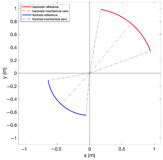 Figure 15. The Cartesian reference trajectories for backrest motion (solid red curve) and footrest motion (solid blue curve).