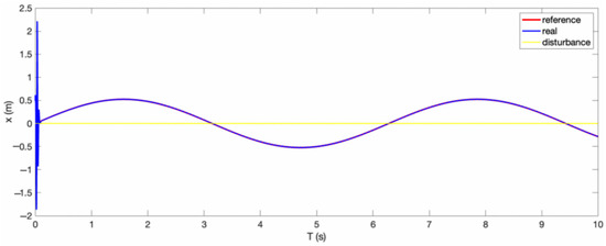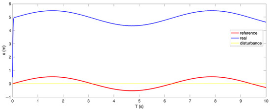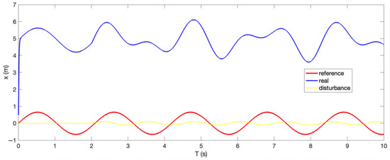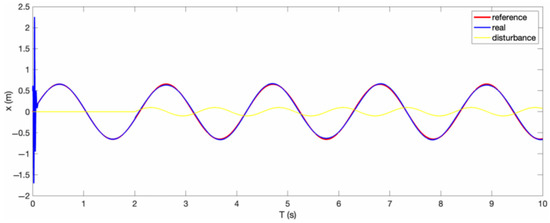 Figure 19. The reference trajectory (red cure) and the system response (blue curve) of the footrest posture control without RBFNN approximation with disturbance (yellow curve).