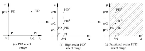 As shown in Figure 1 below, since the values of n in the figure are arbitrary integers and the values of λ and μ are arbitrary real numbers, the conventional integer order PID controller can only vary at a few fixed points in the figure in the plane constructed by P-I-D, as shown in Figure 1a. In contrast, the PID controller with higher order integral links and higher order differential links [18], which is extended on this basis, increases the number of selectable points, as shown in Figure 1b. The fractional order PID control controller can select any point on the plane, and the range of parameter rectification is changed from ‘point’ to ‘surface’, as shown in Figure 1c. This makes the structure of the fractional order PID controller more flexible and more adaptable to the dynamic characteristics of complex control systems, so it is very important in research of fractional order PID control. It should be noted that the above is the setting range of the fractional order PID parameters under ideal conditions. In actual conditions, the implementation of fractional operators, by higher order filters, does not strictly ensure continuous coverage of the plane of selectable fractional parameters, just an approximation.