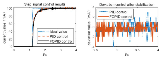 From Figure 14, it can be seen that the objective function of fractional order PID controller reached the optimal value when the number of iterations was 62, while the objective function of PID controller reached the optimal value when the number of iterations was 83. In addition, the optimal value of the objective function under fractional order PID control was 0.3270, which was obviously smaller than the optimal value of the objective function under PID control of 0.8821, proving that the objective function optimization of the fractional order PID controller was better than that of the PID controller.