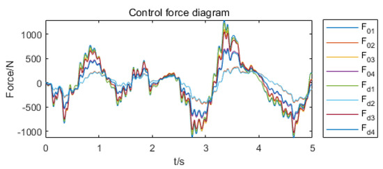 In Figure 15, F 01 , F 02 , F 03 and F 04 were the ideal control forces output under each fractional order PID control, and F d 1 , F d 2 , F d 3 and F d 4 were the actual control forces output under each actuator control circuit control. It can be seen from Figure 12 that the actual control force curves of each were very close to the ideal force curves, where the root mean square value of F 01 was 498.7255 N and the root mean square value of F d 1 was 474.4669 N, the root mean square value of F 02 was 191.0024 N and the root mean square value of F d 2 was 182.0270 N. The root mean square value of F 03 was 470.0384 N and the root mean square value of F d 3 was 447.5908 N, the root mean square value of F 04 was 335.9472 N, and the root mean square value of F d 4 was 320.2643 N. The difference between the actual control force and the ideal control force was not more than 5%, which proved that the control effect of the circuit could meet requirements and ensure the ideal. The actual control force and the ideal control force were basically the same, which proved that the designed actuator control circuit scheme was feasible.