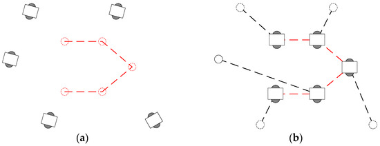 Illustration of the traditional UGV formation control method. In (a), set the formation area near the MUVs to facilitate unmanned vehicles to track nodes; in (b), the unmanned vehicle tracks the node closest to itself and forms the expected formation.