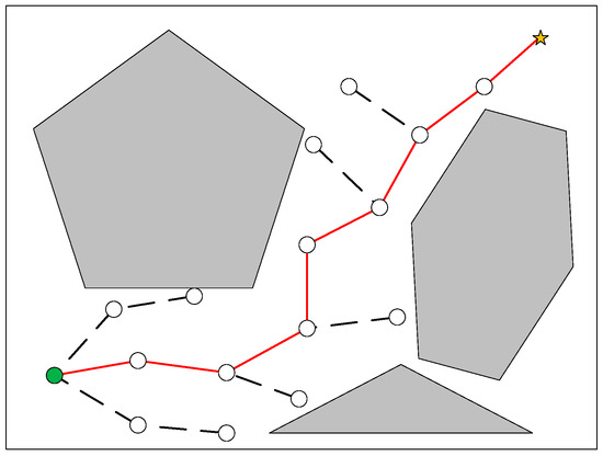 As a common path search algorithm, RRT takes the starting point of the path as the root node and the target node as the leaf node and expands based on the starting point to grow in all directions, generating a search tree with branches growing randomly. When a route linking the starting point and the target point similar to the red line in Figure 2 is obtained during the search, i.e., a solution is found in the space, at which point the expansion of each point stops. In the process of search, once a new expansion node encounters an obstacle, the node will no longer expand and select the previous node of the current node to continue to expand, which ensures that the final search result obtained will not collide with the obstacle.