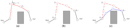 Due to the asymptotically optimal nature of the RRT*, the new path generated is flatter than the original path, so the original path is replaced by the path to obtain the new path , as shown in Figure 3c.