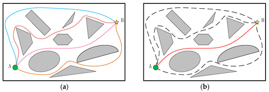 Illustration of the evaluation function. In (a), run the dual RRT optimization multiple times to get multiple desired paths; in (b), use the evaluation function to get a better path as the final result of the algorithm.