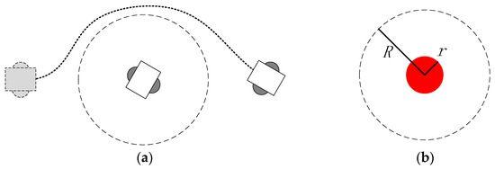 For vehicles on the move, the obstacles that need to be avoided are not only those originally existing on the map but also the rest of the vehicles within the MUVs, which makes the vehicle’s own environment more complex during the driving process. In order to ensure that a safe distance is maintained during the driving process to avoid collision, this paper adopts the way of expanding the radius to set the obstacle avoidance area of the vehicle, as shown in Figure 5a, which is regarded as maintaining the safe distance when the vehicle is driving outside the area. In the whole experimental process, each vehicle and its obstacle avoidance area can be simplified as shown in Figure 5b, the red circle center represents the unmanned vehicle, and the black dashed part represents the obstacle avoidance area formed by this unmanned vehicle based on the obstacle avoidance radius, where indicates the vehicle length and indicates the obstacle avoidance radius