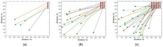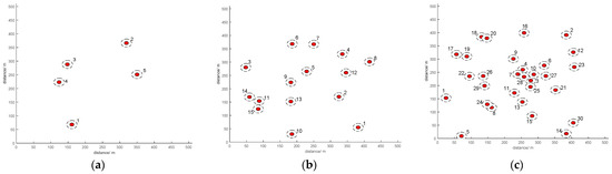 Initial positions of vehicles in MUVs with different numbers of vehicles. (a–c) represent initial positions for 5, 15, and 30 vehicles, respectively.