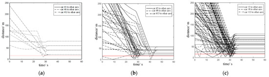 The distance changes with time between some vehicles and other vehicles under different numbers of vehicles. (a–c) represent the distance changes for 5, 15, and 30 vehicles, respectively.