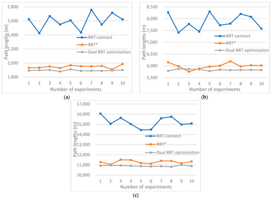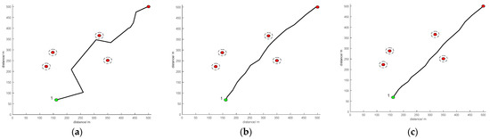 The path results of each algorithm for vehicle No. 1 with 5 vehicles in MUVs. (a) is the path result of RRT-connect; (b) is the path result of RRT*; (c) is the path result of dual RRT optimization.