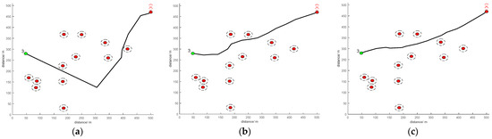 The path results of each algorithm for vehicle No. 3 with 15 vehicles in MUVs. (a) is the path result of RRT-connect; (b) is the path result of RRT*; (c) is the path result of dual RRT optimization.