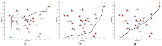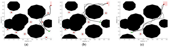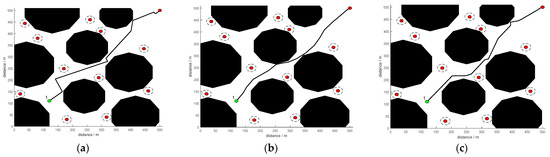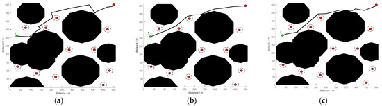 Optimization of different vehicle path results with dual RRT optimization under Map No. 1. (a–c) represent the optimization results for vehicle No. 4, vehicle No. 6, and vehicle No. 11, respectively.