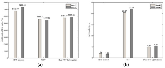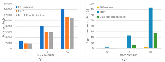 Figure 12a gives the total path length of the path results of each algorithm after the MUVs complete the formation arrangement for different numbers of vehicles. It can be seen that the total path length under the dual RRT optimization is the smallest among all the algorithm results and has better path results than the other algorithms. Figure 12b represents the algorithm running time for different numbers of vehicles. The graph shows that RRT-connect always takes the shortest time regardless of the number of vehicles in the MUVs. In contrast, RRT* consistently takes longer to complete the algorithm, and dual RRT optimization takes somewhere in between, but significantly less than RRT*. Combined with the previous results on path length, dual RRT optimization can obtain similar or even better path results than RRT* using far less time than the RRT* algorithm takes to run.