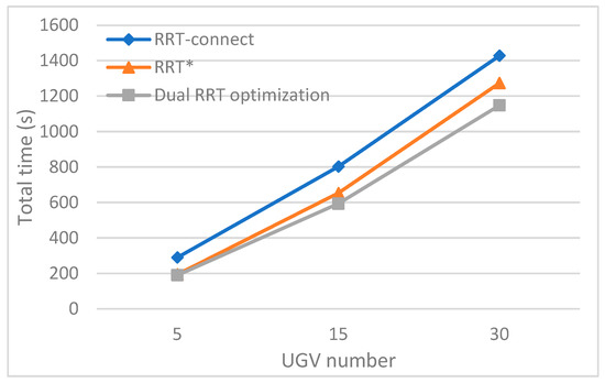 To better show the advantages of dual RRT optimization, we consider the overall time used from the time the algorithm starts running to the time the convoy travels to complete the desired formation based on the path results, assuming that the vehicle maintains a uniform speed of 10 m/s during the movement, the final result is shown in Figure 13. This also shows that, from a practical point of view, dual RRT optimization can complete the task of the formation of a large number of MUVs in a much shorter time, effectively improving the overall speed of the process.
