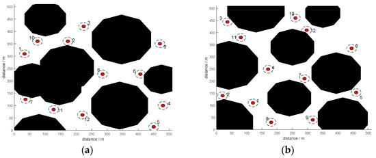 Initial positions of vehicles in MUVs under different maps. (a,b) are the initial positions for Map No. 1 and Map No. 2, respectively.