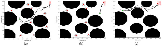 To visualize the comparison of the path results of each algorithm, it is assumed that the unmanned vehicles in the experiment are all similar, the vehicles all move at the same uniform speed and satisfy the vehicle non-completeness constraint. The initial positions of the vehicles are randomly distributed on the map, and the specific initial positions of different numbers of MUVs under the map are shown in Figure 8, where the vehicles have been simplified in the way of Figure 5b, i.e., the red circle center represents the UGV, and the black dashed part represents the obstacle avoidance area formed by this vehicle based on its radius of obstacle avoidance. For easy identification, specific vehicle markers have been shown near each vehicle, and the expected formation is generated in the northeast corner of the map. It can be seen that the higher the number of vehicles in the MUVs, the higher the density of vehicle distribution within the map, the more likely collisions among vehicles will occur, and the planning of obstacle avoidance paths will be more challenging.