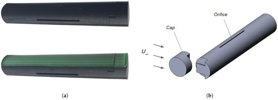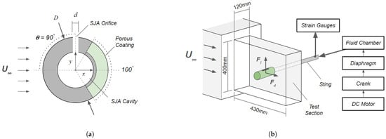 SJAs impart momentum to a flow through a train of vortices generated by cyclically ingesting and ejecting surrounding fluid through an orifice [13]. By ‘synthesising’ this jet from the surrounding fluid, they operate without net mass input, avoiding the need for an auxiliary fluid supply. SJAs can make large-scale alterations to the flow field relative to its characteristic length scale [13]. The layout of a SJA consists of an orifice with width d, a cavity, and an actuator to drive the fluid motion, which can be piezoelectric, electromagnetic, acoustic, or a mechanical device [14]. The layout of the SJA used in this current study is shown in Figure 1a for reference. The vortex train is generated through successive expulsion phases, in which the actuator drives fluid out of the cavity through the orifice, rolling up to form vortex rings [15]. The vortex ring moves away from the orifice provided its position and momentum is such that it will not be re-ingested during the following ingestion phase [13]. During the expulsion phase, the addition of momentum can re-energise a low-energy boundary layer region while, during the ingestion phase, low-momentum fluid is removed from the boundary layer. Therefore, both phases may help delay separation of the boundary layer. This increases the pressure on the lee of the cylinder and reduces the pressure drag [16].