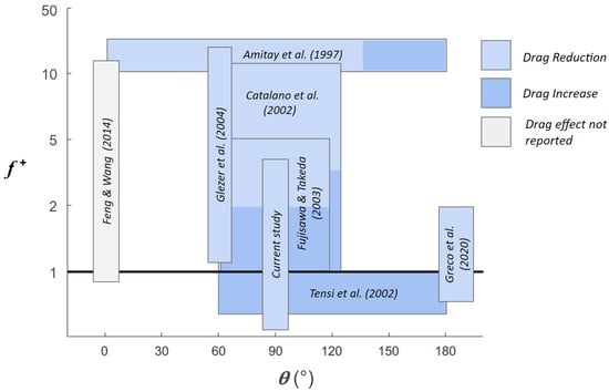 Summary of literature on drag reduction of cylinders in crossflow using SJAs [4,5,6,7,22,23,25]. Each box in the , space represents the limits of these variables investigated.